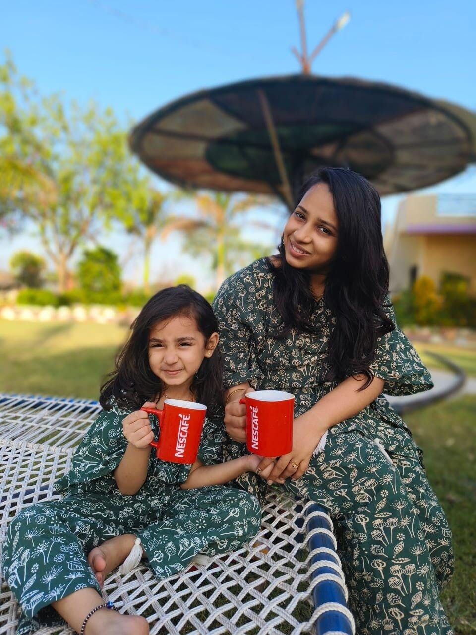 The green and white color combination with subtle prints makes this set both chic and timeless, providing a coordinated look for both mother and daughter. Whether you're spending quality time together or capturing precious moments, this combo ensures you both feel stylish and comfortable.